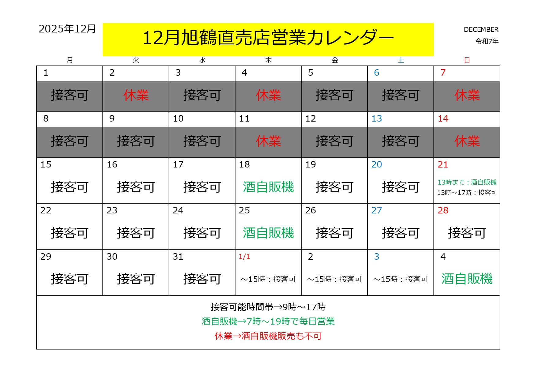 12月の営業につきまして 2025.12.012025.12.16 12月につきまして、下記のカレンダーのとおり営業いたします。 接客可の営業時間は以下の通りです。9:00~17:00 「酒自販機」は7:00~19:00で毎日ご利用いただけます。※熨斗・ギフト包装・配送手配は承ることが出来ない時間帯です 皆様のご来店を心よりお待ちしております。