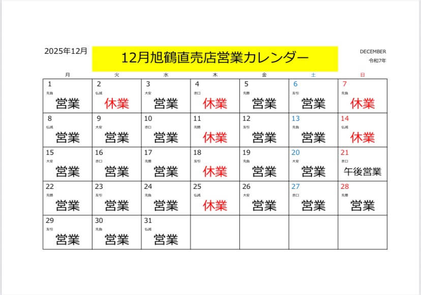 12月につきまして、下記のカレンダーのとおり営業いたします。